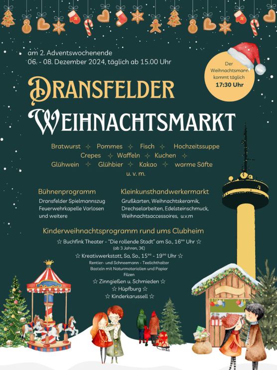 Auch in 2024 werden wir Bördel wieder mit einer Hütte am Weihnachtsmarkt in Dransfeld vertreten und vielleicht auch unsere inzwischen fest zugeordnete Hütte noch schöner dekorieren. Es wäre also schön wenn sich möglichst viele den obigen Termin schon einmal vormerken würden, so dass wir genug Freiwillige für die Schichten zusammen bekommen.